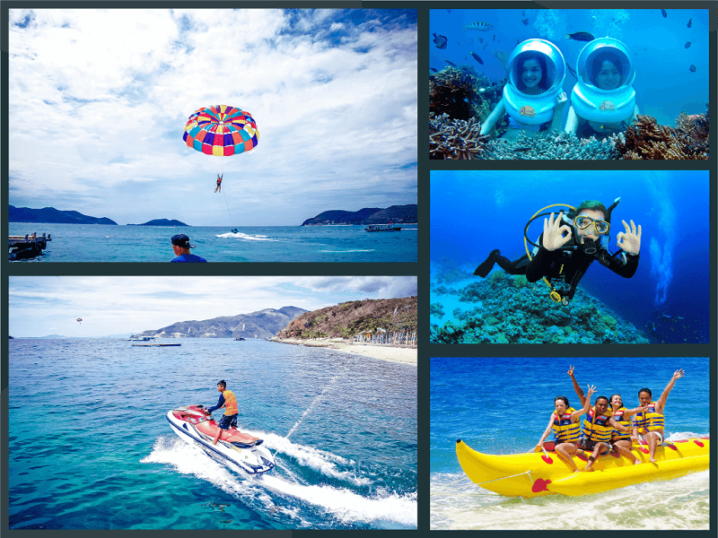 Ngoài ra quý khách có thể đăng kí tham gia các trò chơi biển như: moto nước, phao chuối, bay dù, lặn biển….Dịch vụ lặn biển khám phá đáy đại dương bằng bình dưỡng khí hoặc đi bộ dưới đáy biển, có chuyên viên đi kèm. Quý khách thoải mái ngắm nhìn những loài san hô tuyệt đẹp, các đàn cá, các loài sinh vật biển quý hiếm của khu bảo tồn biển lớn nhất Việt Nam. Quý khách không biết bơi sẽ được các huấn luyện viên lặn đi cùng xử lý mọi thao tác kỹ thuật trong suốt quá trình tham gia khám phá đáy đại dương. ( chi phí tự túc)