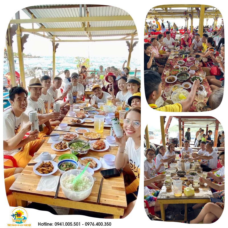 Sau khi tham quan thỏa thích vui chơi, tắm biển, hdv sẽ đưa quý khách tới nhà hàng trên Bè Nổi tại Làng Chài để thưởng thức bữa trưa với những món ăn miền biển đặc sắc nhất. Quý khách cũng có thể đặt thêm các món ăn hải sản tươi sống khác với chi phí tự túc như tôm hùm, cua, ghẹ, ốc biển...